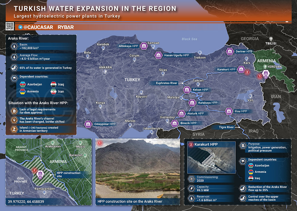 Y mientras Armenia “solicita autorización” a Turquía y espera respuesta para comenzar las obras, el gobierno de Ankara ha construido decenas de presas con centrales hidroeléctricas sin ningún tipo de coordinación, lo que le ha dado al Estado turco la posibilidad de controlar el caudal de los ríos en Armenia, Azerbaiyán y otros países vecinos de la región. Ankara no participa en ningún convenio internacional sobre el agua, pero aun así impone condiciones a sus vecinos.