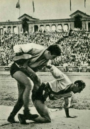 Se escuchan los sonidos de zurna, duduk y dhol (instrumentos armenios de viento), al ritmo tradicional que siempre se les interpreta a los luchadores, los jóvenes se quitan la camisa, se aprietan bien las fajas y comienzan un baile emocionante, caminan en círculos, juegan con sus músculos, se exhiben frente a los presentes con cada movimiento. Los luchadores saltan fácilmente o se ponen en cuclillas, levantan una u otra mano, hacen flexiones desde el suelo con las manos, hacen varios ejercicios en el baile, todo esto está detallado en los archivos de época.